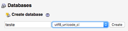 - Na página do phpMyAdmin, criei um banco de dados chamado teste com colação utf8_unicode_ci, que aceita caracteres especiais.